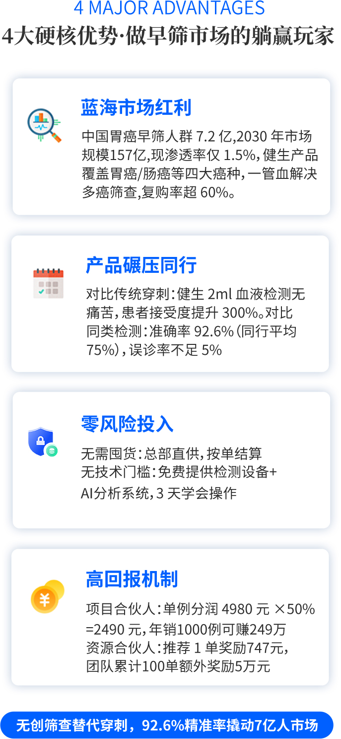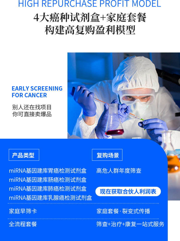 健生公司聘請了多名海外華人教授,引進美籍華人科學(xué)家王家旺教授共同研發(fā)打造miRNA早期診斷惡性腫瘤產(chǎn)品。利用miRNA分子診斷惡性腫瘤核心技術(shù),研發(fā)轉(zhuǎn)化胃癌診斷、腸癌診斷、肺癌診斷等覆蓋全癌種的早診早篩分子診斷惡性腫瘤產(chǎn)品。